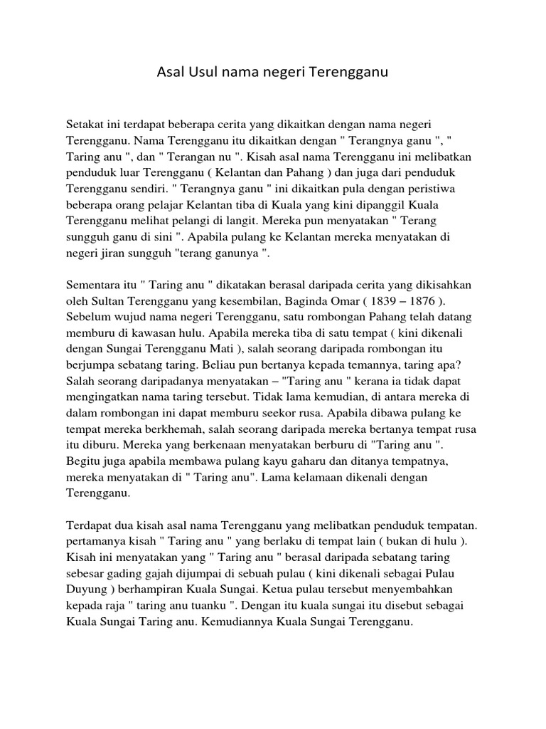 Kisah ini menyatakan yang Taring anu berasal daripada sebatang taring sebesar gading gajah dijumpai di sebuah pulau kini dikenali sebagai Pulau Duyung berhampiran Kuala Sungai. Asal Usul Nama Daerah Marang Terengganu MARANG Asal usul nama Daerah Marang ini dipercayai berasal daripada nama seorang peniaga berketurunan Cina yang sangat terkenal pada masa dulu. Kuala Terengganu adalah satu bandar raya perdagangan maritim yang penting pada zaman purba.